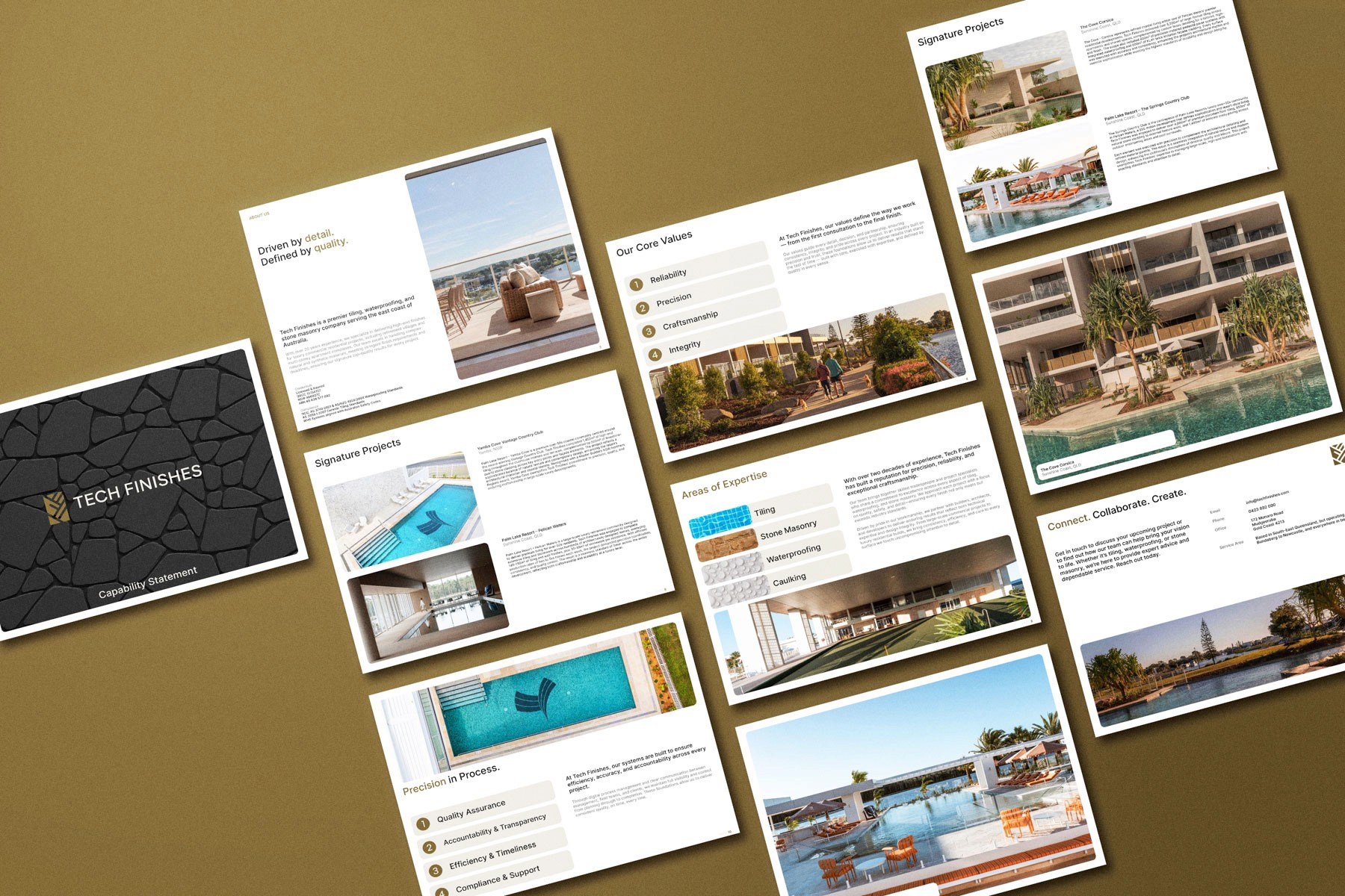 The updated identity refines the original brand into a sharper, more versatile system, allowing it to perform consistently across uniforms, signage, digital platforms, and marketing material. Alongside the visual refresh, we delivered a new website and a capability statement, designed to clearly communicate Tech Finishes’ expertise in high-end tiling, waterproofing and stone masonry projects.